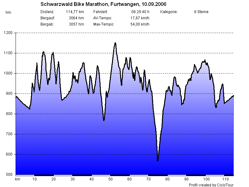 Nach einer kühlen Nacht im Schlafsack klingelt kurz nach 5 Uhr der Wecker. Ich kraxel aus dem Auto und würge mein Frühstück runter. Zu der Zeit hält sich der Hunger noch in Grenzen. Es ist sau kalt an dem Morgen, aber es wird trocken und sonnig werden, genau meine Bedingungen. Gegen 6:30 Uhr wird es langsam hell und ich rolle die ersten Meter ein. 10 Minuten vor dem Startschuss stehe im Startblock und bemerke, dass ich den Pulsmesser vergessen habe. Das kann ja heiter werden. Über diese Distanz ganz ohne Drehzahlmesser. Egal, muss ich eben nach Gefühl fahren. Nach Kirchzarten und Salzkammergut sollte das eigentlich klappen. Pünktlich um 7 fällt der Startschuss und das Feld setzt sich in Bewegung. Da es relativ flach aus dem Ort herausgeht wird gleich ein hohes Tempo gefahren. Bei den kühlen Temperaturen erwarte ich sehnsüchtig den ersten Anstieg. Hier wird mir wieder warm. Trotzdem arbeitet die Beinmuskulatur etwas widerwillig bei den einstelligen Umgebungstemperaturen. Ab Km 30, als wir abermals Start/Ziel in Furtwangen passieren, wird es besser. Die Sonne lugt nun über die durchwegs bewaldeten Hügel und wärmt uns Fahrer. Mehrmals finde ich gleichstarke Fahrer mit denen ich zusammenarbeiten kann um die ein oder anderen Körner zu sparen. So vergeht die Zeit wie im Flug, die Strecke geht ständig auf und ab, ein konstanter Rhythmus lässt sich kaum finden. Von den Verpflegungsstellen, an denen es alles Nötige wie Riegel, Gel, Getränke usw. gibt, nehme ich maximal jede zweite in Anspruch. Bei Km 50 bin ich dann leider zu einer ungeplanten Pause gezwungen. Der hintere Reifen ist platt. Und es dauert relativ lange, bis ich wieder fahrbereit bin. Während ich am Wegesrand stehe, fahren die ersten der kleineren Runden an mir vorbei. Auch viele von meiner Strecke muss ich, nachdem ich wieder Fahrt aufgenommen habe, abermals überholen. Die Wegbeschaffenheit scheint es in sich zu haben. Ich sehe heute aussergewöhnlich viele Fahrer mit Reifenproblemen. Und das nicht unbedingt nach Abfahrten, wo erfahrungsgemäss mit Durchschlägen zu rechnen ist. Wie sich später herausstellt, war es bei mir vermutlich ein kleiner Dorn der der Luft den Weg nach draussen geöffnet hat. Das Fahrverhalten meines Fusion Hardtails ist nun deutlich anders, da ich nicht ganz den vorherigen Luftdruck erreicht habe. So muss ich die Abfahrten mit etwas mehr Vorsicht angehen um nicht einen weiteren Defekt oder gar Sturz zu riskieren. Wie auf meinen Marathons zuvor, kann ich auch dieses mal gegen Ende einige Plätze gut machen. Wobei sich die letzten 30 km als die übelsten herausstellen. In ständigem, leichten Auf und Ab geht es scheinbar endlos dahin. Die Kilometer summieren sich nur zäh auf dem Tacho. Und als ich schon denke, ab jetzt geht's eben ins Ziel, geht die Strecke nochmals auf einen 100 hm-Abstecher. Die letzten Kilometer nahezu eben am Fluss entlang geht es schliesslich doch nach Furtwangen hinein. In den letzten engen Kurven kann ich nochmals Plätze gut machen und rolle nach einer Gesamtzeit von 6:49 als 55ster in der Herrenklasse über die Ziellinie.