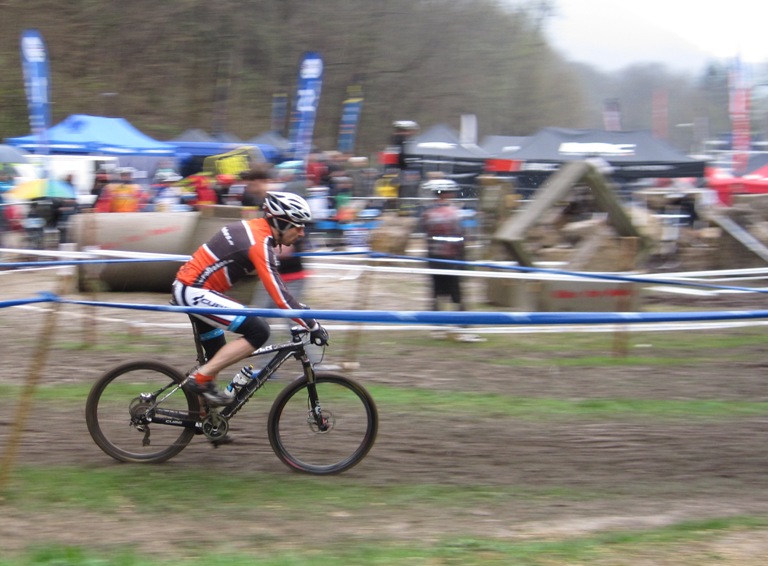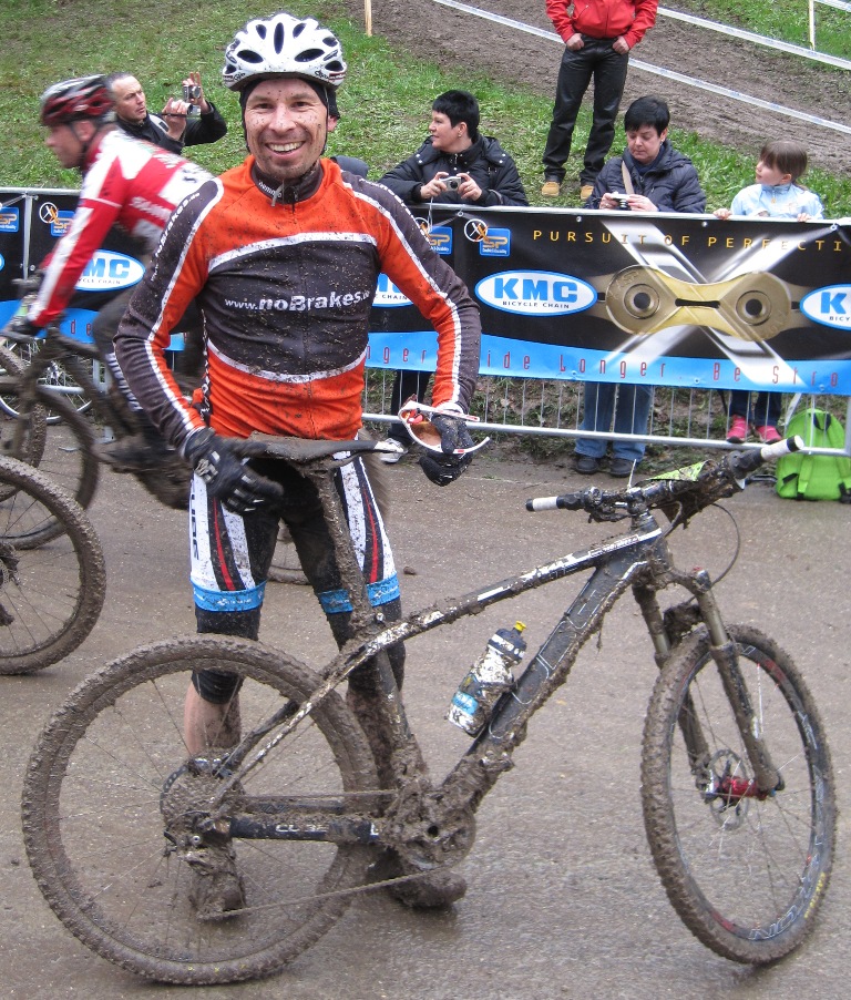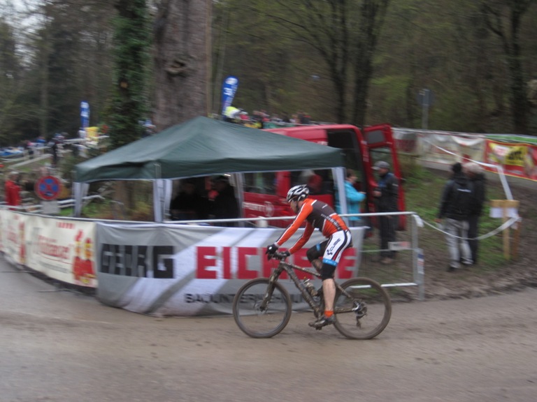 Bis das Rennen in der Klasse Ü40 startet, ist die Temperatur auf immerhin angenehme 6 Grad angestiegen. Zusammen mit der Ü30 Klasse sind wir knapp 50 Fahrer im Startblock. Dann endlich fällt der Startschuss. Es geht wie immer schnell los und ich komme gut und ohne Zeitverlust um die ersten Ecken. Zu Beginn sind noch alle gut unterwegs. Ab der zweiten Runde macht sich das tiefe Geläuf bemerkbar und die ersten Fahrer haben mit Schaltproblemen zu kämpfen. Auch mich ereilt es in der dritten Runde, und ich muss den hinter mir lauernden Viertplatzierten vorbei lassen. Bald bin ich wieder auf dem Rad und lege einen Zahn zu, eine Platzierung unter den Top 5 möchte ich auf jeden Fall halten. Die nun beginnenden Überrundungen sind heute ganz schön tricky, da bei den Bedingungen keiner weiß, wer in welche Richtung rutscht. Meine Schlammreifen laufen dagegen gut und ich kann kontrolliert und ohne Wackler die letzten Runden zu Ende fahren. Nach der Zieldurchfahrt bin ich mir sicher, den 4. oder 5. Platz erreicht zu haben. Umso mehr bin ich überrascht, auf dem zweiten Platz gefinished zu haben.