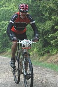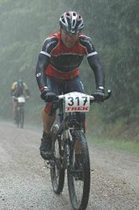 Wege: Es gab alles: Geteerte Straßenabschnitte und Feldwege, weiche Mineralbetonwege, die vom Regen aufgeweicht waren, sowie harte, festgefahrene Feld- und Waldwege mit vielen Steinen und Löchern, auf denen einige Fahrer ihre Schläuche tauschten. Bei dem Gedanken an einen, ca. 2 km langen, von Langholz-LKW’s und Traktoren knüppelhart festgefahrenen Grasweg zum Wald, tut mir jetzt noch der Hintern weh (ich dachte an ein Fully!). Es gab aber auch schnelle Waldwege a’ la Albvereinsweg und wurzelbestückte Trails am Hang entlang. Wir mussten auch bergauf in einem Waldweg schieben. Wir fuhren Waldwege, die bis zum Rand mit braunem Wasser gefüllt waren. Beim Befahren eines solchen Weges denkt man gar nicht darüber nach, ob sich unter der Brühe Steine oder Wurzeln befinden, es gab auf jeden Fall reichlich davon. Es war eine pure Schlammschlacht, wie es manchmal in der BIKE zu sehen ist. Nur dieses Mal, waren wir selbst dabei. Unter trockenen Bedingungen ist der Marathon nicht schwer zu fahren.