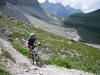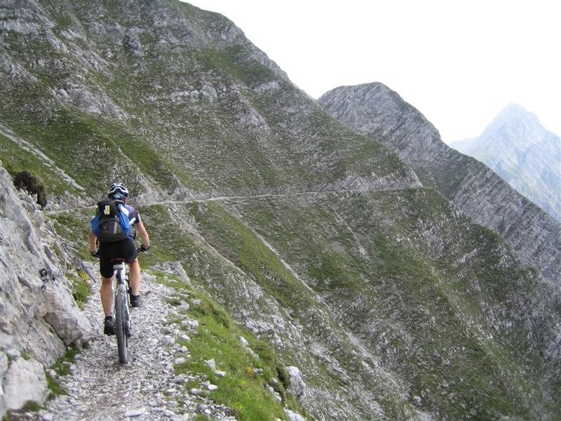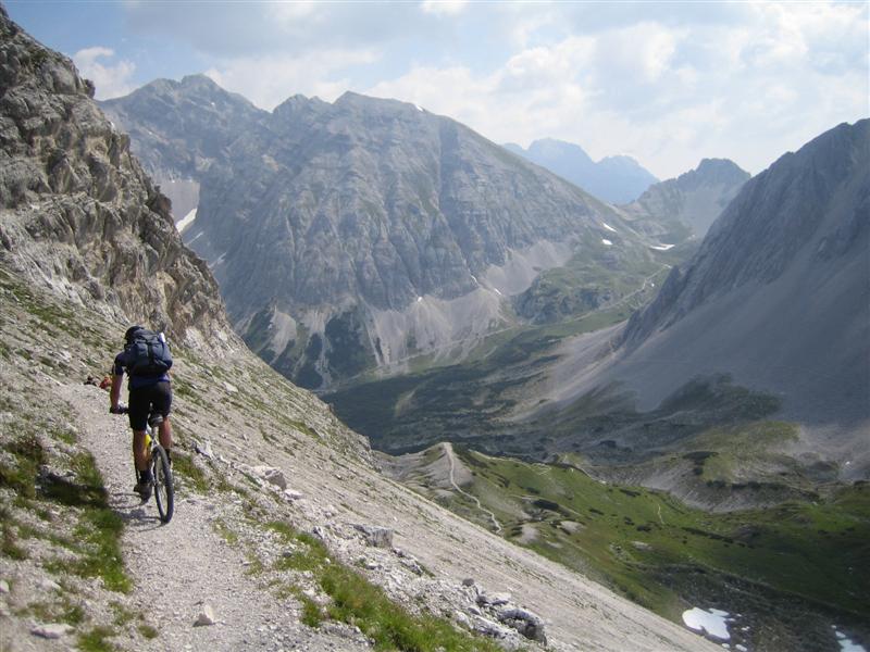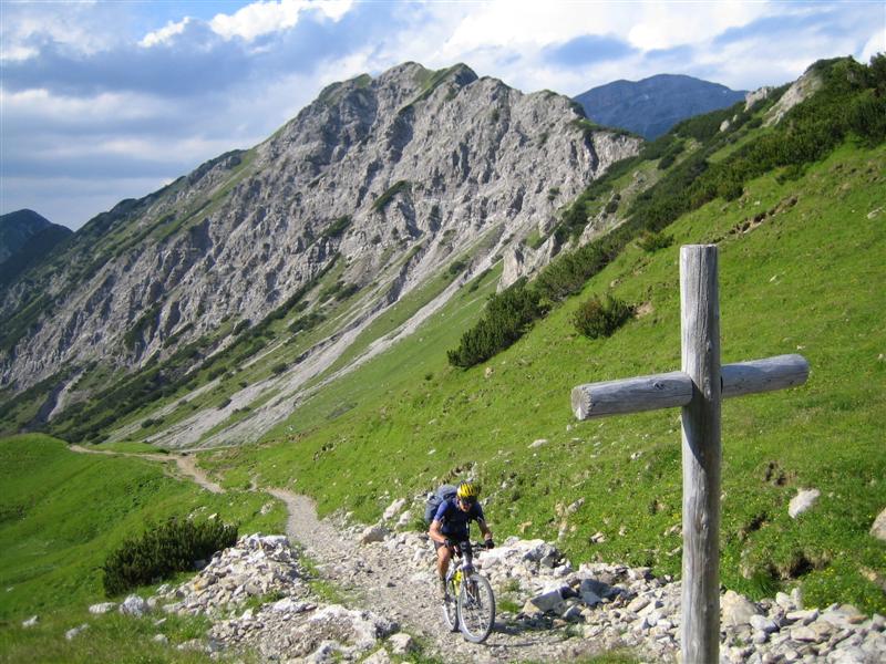 Auf dem Wanderparkplatz nahe Mittenwald stellen wir das Auto ab und starten Richtung Scharnitz. Hier biegen wir links in die Karwendeltäler ein. Nach nicht ganz 2 Stunden sind wir am Karwendelhaus angelangt. Kurzer Orientierungsstop und schon gehts weiter. Nach der Abfahrt zum kleinen Ahornboden, wo wir unsere Tanks am Brunnen füllen, folgt der Trail zur Falkenhütte. Die nach dem Trail folgende steilste Schotterauffahrt können wir gerade noch ohne Absteigen hoch drücken. Bald sind wir am Spieliss Joch kurz vor der Falkenhütte angelangt. Wir folgen dem Trail zunächst talwärts um dann ein Geröllfeld zu queren. Wir gelangen aufs Hohljoch. Von hier wollten wir eigentlich die Abfahrt Richtung Eng nehmen. Leider ist der Weg für Biker gesperrt und wir wollen uns nicht mit den zahlreichen Fussgängern anlegen. So sind wir gezwungen, dem Laliderer Bach entlang ins Rissbachtal abzufahren um auf der Strasse nach Eng zu kommen. Hier folgt nun der teilweise steile und mit losem Schotter belegte Aufstieg zum Lamsenjoch. Vom Joch führt ein super Trail zur Lamsenjoch Hütte, unserer heutigen Übernachtung.