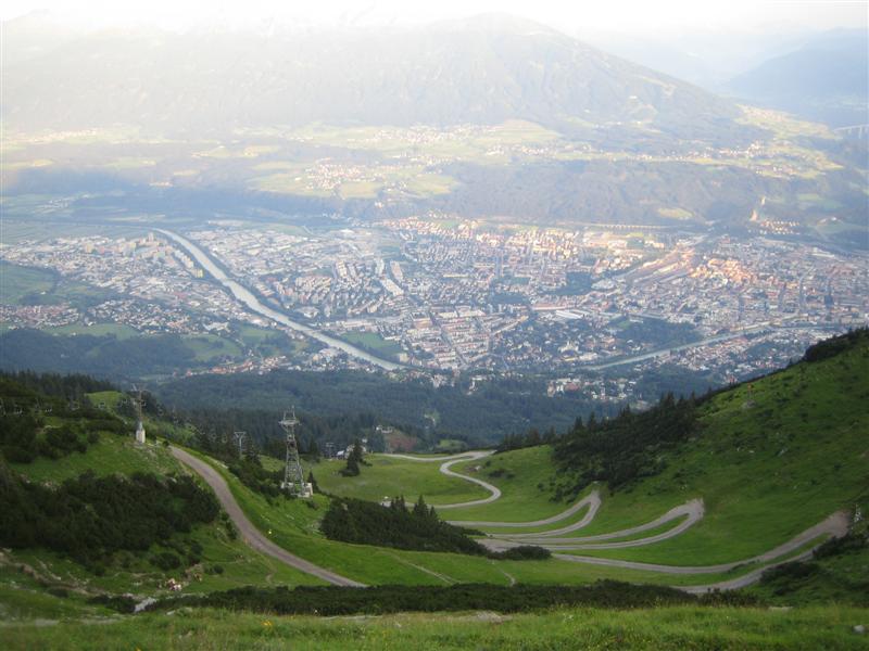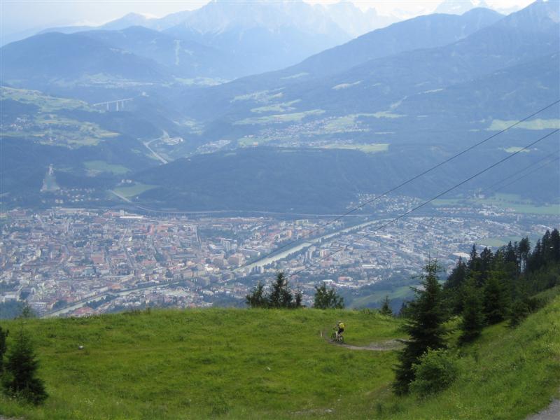 Mit hoher Geschwindigkeit folgen wir der Schotterpiste ins Tal. Wir suchen unseren Weg durch die kleinen Ortschaften, bis wir nach Hall kommen. Hier nehmen wir den Aufstieg ins Halltal. Auf absolut steiler, aber neu geteerter Strasse gehts aufwärts. Als der Weg in Schotter übergeht wirds zum Glück flacher. Vom Issjöchl erwartet uns eine fast einstündige Schiebe- und Tragepassage hinauf zum Törl. Von hier folgt ein super Trail zunächst zur Kaisersäule und dann hinab zur Thaurer Alm. Da wir uns nicht sicher sind, ob die anschliessenden Wanderwege vernünftig fahrbar sind, folgen wir der Schotterpiste ins Tal. Auf schönem Rad-Wanderweg gelangen wir Richtung Hungerburg und zur Einfahrt der Schotterpiste die uns zum Hotel Seegrube führt. Während der Auffahrt ziehen mehrere Gewitter durch und wir sind zwischendurch zum Anhalten gezwungen. Unterwegs queren wir mehrmals den 'Nordpark-Trail'. Beeindruckend, was die Vertriders hier in den Hang gezimmert haben. Wir würden jedenfalls keine 10 Meter auf dem Trail sturzfrei hinbekommen. Eine kurze Passage fahre ich dann doch. Oben am Hotel Seegrube angekommen, bekommen wir ein Bett im Lager. Wobei die Lokalität den Namen 'Hotel' nicht verdient. Es wirkt alles schon recht runtergekommen.