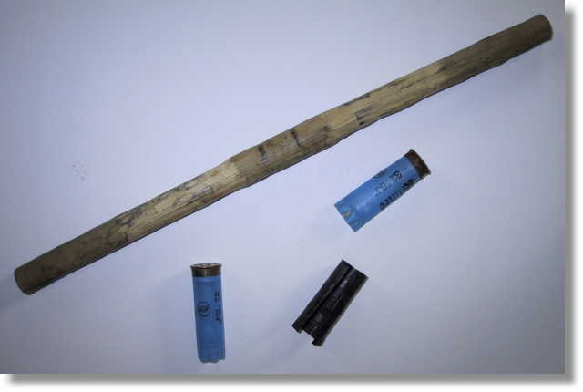 Oben der ausgedienter Besenstiel, der erst auf Länge gesägt und dann nach aussen hin auf den Durchmesser der Schalt- und Bremshebel geschnitzt wird. Die Breite des Lenkers so gering wie möglich wählen, um die Hebelwirkung zu verringern. Das schwarze Teil ist die Hülse einer Schrotpatrone. Diese dient zur Druckverteilung an der Vorbauklemmung. Die blauen Teile (auch Schrotpatronen) werden in Streifen geschnitten, und je nach Bedarf unter die GripShifts geschoben, bis diese beim Schalten nicht mehr verrutschen.