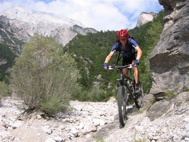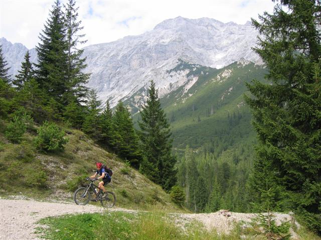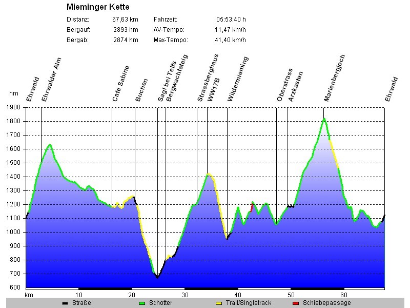 Trotzdem packen wir unsere Rücksacke für eine Zweitagestour mit Übernachtung. Wir fahren nach Ehrwald und stellen das Auto an der Talstation der Ehrwalder Alm Bahn ab. Punkt 9:30 Uhr sitzen wir auf dem Bike. Wir folgen der Ausschilderung 'Ehrwalder Alm'. Leider erwischen wir den Fussweg, und ignorieren das kurz darauf folgende Bike-Verbotsschlild. Es geht gleich sakrisch steil zur Sache. Wir überholen einige schiebende Biker und haben dabei selbst grösste Mühe, auf dem Bike zu bleiben. Einfacher ist es sicherlich, den Fahrweg zu nehmen. Leider war dieser unten nicht ausgeschildert. Egal, bald sind wir oben und zeihen uns was winddichtes über unsere bereits nassgeschwizten Klamotten. Den beschriebenen Abstecher zum Seebensee lassen wir aus, und rollen gleich das Gaistal hinunter. Aufgrund der unzähligen Radler und Wanderer die uns entgegenkommen, können wir sowohl unsere Reaktion testen als auch unsere Bremsen auf Betriebstemperatur bringen. Carsten ist heute mit seinem neuen Cube-Endurobike unterwegs und umfährt die meisten 'Hindernisse' einfach abseits des Weges. Ab Moos nehmen wir den Trail 24. Dieser führt durch eine Art Moorgebiet und verläuft deshalb teilweise auf Holzdielen. Sozusagen 'Northshore für Anfänger'. Nach Buchen nehmen wir den Trail abwärts nach Sagl bei Telfs. Von Carsten sehe ich hier nicht viel, ausser den von ihm aufgewirbelten Staub. Der Trail ist super zu fahren, loses Geröll, ausgewaschene Rinnen, Felspassagen, alles dabei was Spass macht. Mit meinem Cross-Country-Fully bin ich etwas vorsichtiger unterwegs. Carstens Reifen sind dem hohen Tempo aber nicht ganz gewachsen, und verlieren plötzlich etwas Luft. Bevor wir ganz unten sind pumpt Carsten ein- bis zweimal nach. Unten in der Stadt macht's dann plötzlich 'pffffffft' und der Reifen ist platt. Gut, denn wir sind gerade an 'nem Einkaufzentrum mit Sitzgelegenheiten und Bistro. Carsten wechselt und flickt den Reifen. Ich bin etwas ungeduldig, da es schon zwölf Uhr ist und wir bisher kaum Höhen- und Kilometer gemacht haben. Carsten kauft sich noch 'nen Kaffee und ein Baguette und es kann weitergehen. Wir suchen die Einfahrt zum Bergwachtsteig und fahren einige Meter auf dem Trail um dann den Anstieg zum Strassberghaus zu erreichen. Am Strassberghaus füllen wir unsere Tanks um weiterhin bergwärts zu fahren. Unsere Tourbeschreibung sagt uns, wir sollen zur neuen Alplhütte fahren. Mittlerweile haben wir aber beschlossen, die Tour an einem Tag zu machen. So lassen wir die restliche Auffahrt zur Hütte und biegen lieber auf den WW17B ein. Dieser ist zwar kein Teil der beschriebenen Tour, sieht aber auf der Karte sehr interessant aus. Zu Beginn bin ich skeptisch und befürchte, auf dem gestrichelt eingezeichneten Weg keinen Meter fahren zu können. Aber meine Befürchtungen sollten sich nach wenigen Metern auf dem sagenhaften Singletrail zerschlagen haben. Ebene Teilstücke wechseln ab mit steilen Felspassagen, Spitzkehren, Slalom und kurzen Uphills. Ein Traum. Carsten schafft mit dem neuen Bike alles zu fahren, ich muss ein paar mal absteigen, da mich an manchen Stellen der Mut verlässt. Noch völlig high vom Singletrailsurfen sind wir irgendwann unten und fahren kurz vor Wildermieming gleich wieder bergwärts, um am Hang entlang nach Unterstrass zu gelangen. Hier folgen wir den Schildern nach Arzkasten. Im Gasthof füllen wir unsere Speicher, denn wir haben nun doch schon über 2000 hm in den Beinen. Unbedingt den hausgemachten Apfelstrudel probieren, lecker. So gestärkt nehmen wir die 600 hm zum Marienbergjoch in Angriff. Nach 45 min haben wir die gute Schotterauffahrt hinter uns gebracht und suchen nach einer interessanten Abfahrtsmöglichkeit. Zunächst ist nichts zu finden, aber auf halber Höhe zweigt doch noch ein Trail von der Schotterautobahn ab. So können wir noch einige Höhenmeter auf einem abermals super Singletrail vernichten. Ab der Talstation nehmen wir den Panoramaweg nach Ehrwald. Wir drücken auf die Tube, da uns von Westen her ein Gewitter im Rücken hängt. Begleitet von Donnergrollen und den ersten Wassertropfen erreichen wir Ehrwald und schliesslich das Auto. Kaum haben wir die Heckklappe geöffnet, beginnt es heftig zu regnen. Excellentes Timing!!