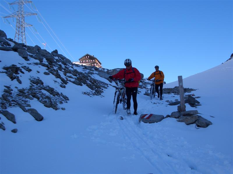 Der Morgen begrüsst uns mit Sonnenschein. Allerdings hat es in der Nacht weiter geschneit. Es ist Schnee bis auf fast 1600 Meter herunter gefallen. Wir plündern zunächst mal, wie üblich, das Frühstücksbuffet. Danach machen wir den dringenden Bikeservice. Das viele Wasser der vergangenen Tage hat seine Spuren hinterlassen. Und der feine Granitstaub der gestrigen Abfahrt wurde vom Wasser bis in die kleinsten Ritzen befördert. In der Tourist Info holen wir Infos über die Schneelage auf den Krimmler Tauern ein. Nach einem Anruf auf einer hochgelegenen Alm sollen oben mehrere Zentimeter Schnee liegen. Wir überlegen lange hin und her und entschliessen uns dann für unsere Ausweichroute über den Felber Tauern. Das bringt zwar unsere gesamte folgende Etappenplanung durcheinander, aber der Felber ist rund 200 hm niedriger als der Krimmler. So hoffen wir, nicht gar so lange im Schnee unterwegs sein zu müssen. Mit einem 30er Schnitt kommen wir in Mittersill an. Hier biegen wir rechts ab um bald den Schildern zur St. Pöltener Hütte zu folgen. Die diesjährige Transalp Challenge nahm ebenfalls diese Route und wir folgen den grünen TAC-Pfeilen. Zunächst auf Teer, später auf Schotter dann auf morastigen Wiesenwegen fahren wir bergwärts. Der durch die kurzzeitige Sonne frisch geschmolzene Schnee macht die Auffahrt zur Schlammsuhle. Wenigstens haben wir das erste mal auf unserer Tour den Ansatz einer Aussicht auf die uns umgebende Bergwelt. Aber am Ende des Fahrwegs und zugleich Beginn der Schiebepassage sehen wir im Hintergrund schon das Unheil herannahen. Keine 10 Minuten später stehen wir im dichtesten Schneesturm. Es gibt kein Weiterkommen mehr. Wir haben keinen blassen Schimmer wo hier der Weg verläuft. So bleibt uns nichts anderes übrig, als fast 45 Minuten im Gelände stehen zu bleiben und das Ende des Schneegestöbers abzuwarten. Als sich Schnee und Nebel verzogen haben, blicken wir auf ein Geröllfeld, durchzogen von mehreren mehr oder weniger gut erkennbaren Wegen. Aber welcher ist unserer? Nach ewiger Sucherei entdecken wir doch noch eine TAC-Markierung und wir folgen den grünen Wegmarken. Ich hoffe nur, dass uns mitten in dem Geröllfeld nicht noch mal so ein Schneegestöber heimsucht. Am Ende des Geröllfeldes stossen wir auf den vom Tal heraufkommenden Wanderweg zur St. Pöltener Hütte. Dieser ist ordentlich markiert und wir können ihm trotz des vielen Schnees problemlos folgen. Zwischendrin gibt's einige fahrbare Abschnitte bevor wir uns in einer dreistündigen Schiebe- und Tragepassage durch den Schnee bergwärts kämpfen. Die frischen Spuren im Schnee belegen, dass wir nicht die einzigen Verrückten sind, die bei diesem Wetter ihre Bikes hier hoch wuchten. Der Weg zieht sich schier endlos. Immer wieder tut sich eine neue Felsstufe auf, die erklommen oder umgangen werden muss. Oli und Siggi lassen es schnell angehen und sind 20 Minuten vor Alex und mir an der Hütte. Ich tue mich etwas schwer, das übergewichtige Fully über die nicht enden wollenden Schneewehen zu lupfen. Schieben ist nicht, da ständig das Vorderrad im Schnee versinkt. Die Schuhe sind eh schon lange durchgeweicht. Ständig tragen will ich aber auch nicht, da man in dem Schnee nicht weiss wo man hin tritt. Teilweise versinken wir bis zu den Knien im Schnee. Fix und fertig kommen wir endlich an der Hütte an. Oli und Siggi geben uns schon die ersten logistischen Hinweise, als wir noch 30 hm weiter unten durch den Schnee stapfen: "Bike hier unten rein, Schuhe im Vorraum ausziehen, Dusche gibt's keine, warmes Wasser schon gar nicht". "Super " denke ich. So beschränken wir unsere heutige Wäsche auf das anziehen trockener Klamotten und Zähneputzen. Der einzig warme Raum der Hütte ist die Gaststube. Die sonstigen Zimmer sind saukalt. Der Trockenraum erfüllt auch nicht seine Funktion. Um uns irgendwie aufzuwärmen bestellen wir erst mal jeder einen Jagertee. Das heisse Getränk wirkt Wunder und nach einer viertel Stunde glühen unsere Wangen und wir können zum gemütlichen Teil des Tages übergehen.
