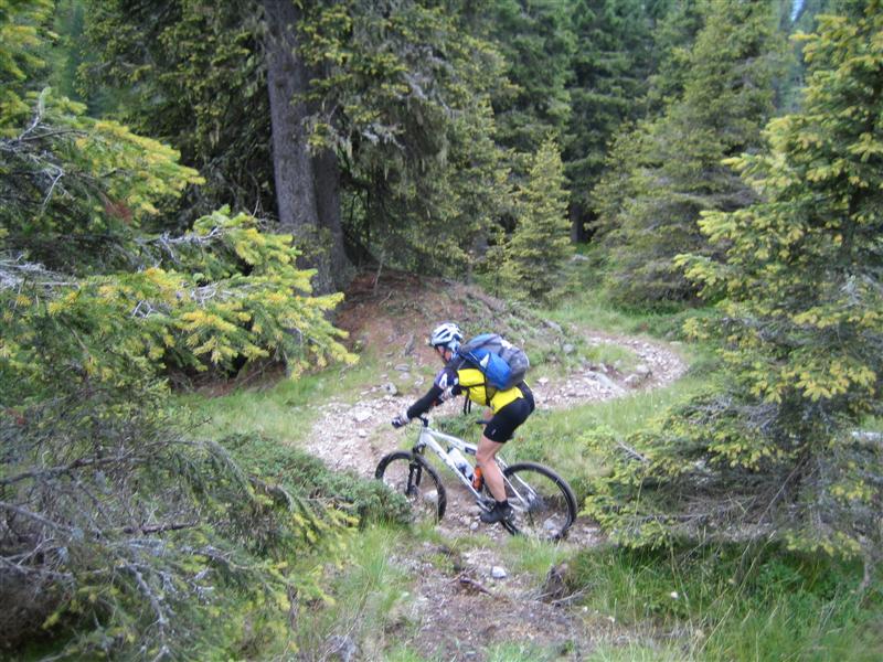 Von der Hütte folgen wir dem schmalen Weg hinauf zur Forcola Ambrizzola. Hier oben fressen uns schier die Pferde den Rucksack vom Rücken und wir schauen, dass wir weiter kommen. Die nun folgende Trail-Abfahrt zählt wohl zu den schönsten in den Alpen. Teilweise flowig, teilweise über grobe Stufen und Geröll. Einfach klasse. Alex holt sich in dem groben Geläuf 'nen gehörigen 8er im Hinterrad. Siggi, seines Zeichens Experte für allerlei Laufraddefekte, hat's im Nu wieder gerichtet, und wir fahren weiter auf dem sagenhaften Trail. Wir gelangen zum Passo Staulanza um kurz danach rechts nach Alleghe abzubiegen. Wir suchen eine vernünftige Auffahrt, und fahren an der Mga Vescova bergwärts. Auf dem 561 queren wir zur Casa di Proda. Von hier folgt der zweite super Trail des Tages. Wir vernichten nun 800 hm auf einem Handtuchbreiten Trail. Mal technisch, mal relaxt, mal ein kurzer Stich bergauf, einfach klasse. Wir sind so berauscht, dass wir ganz vergessen, Bilder zu machen. Von oben angefangen nehmen wir den 564, der links des talwärts führenden Fahrweges verläuft. Dieser erste Abschnitt ist absolut klasse. Steinige Passagen wechseln sich ab mit Wurzeln und Stufen. Ein Traum. Als wir auf dem Fahrweg stehen, sehen wir gegenüber gerade einen Biker im Wald verschwinden. Zum Glück, denn wir hätten vermutlich die Einfahrt zu den Trail nicht gesehen. Wir folgen nun immer den Schildern 'Civetta Superbike'. Über Grashänge und durch Wälder zieht sich der Trail am Hang entlang. Der Trail ist für Bikes gemacht und entsprechend durchgängig befahrbar. Durch die erstklassige Ausschilderung verlieren wir keine Zeit mit Navigation und surfen so am verlassenen Weiler Fernazza vorbei bis hinunter nach Alleghe. Der Trail führt uns quasi bis in die Stadt hinein. Wir sind restlos begeistert und grinsen wie die kleinen Kinder. Wir überlegen schon, hier ein paar Tage Urlaub zu machen, um auch noch die anderen Trails zu fahren.