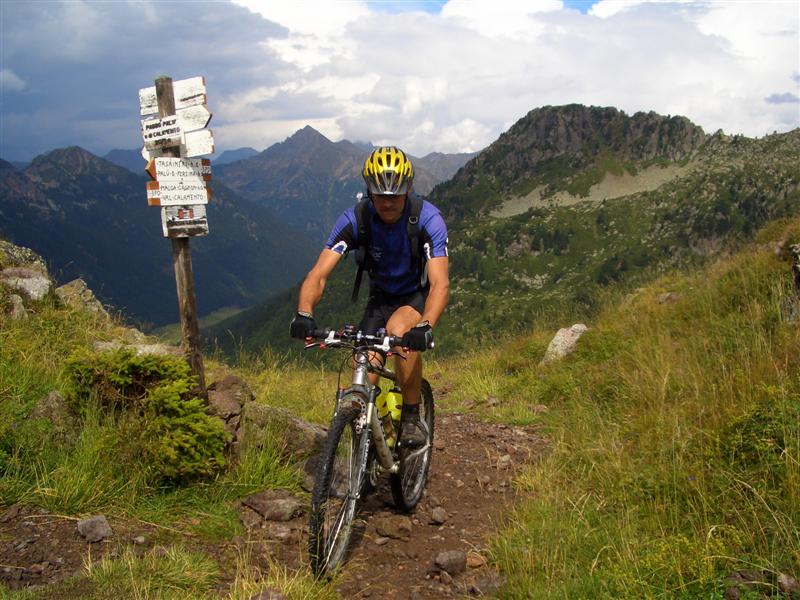 Der gestrige Regen hat sich verzogen und wir fahren in wärmender Morgensonne Richtung Passo di Valles. Aufgrund des ausgiebigen Frühstücks und des damit verbundenen Völlegefühls geht's auf den ersten Kilometern etwas zäh voran. Vom Pass fahren wir mit über 70 Sachen bis zum Abzweig ins Val Venegia. Bei phantastischer Bergkulisse halten wir uns lange mit knipsen auf. Denn so oft haben wir auf dieser Tour noch nicht Berge und Sonne gleichzeitig zu Gesicht bekommen. Von der Baita Secantini geht's auf Wiesentrails und Schotter zum Passo di Rolle. Auch hier hatten wir eine Variante über die Malga Ces eingeplant, die wir aber auslassen. Auf der Strasse und dem kreuzenden Trail fahren wir nach S. Martino Castrozza. Wir kaufen ein, machen Vesperpause und suchen anschliessend den Weg zum Rifugio Tognola. Von hier haben wir etwas Mühe den richtigen Weg zu finden. Aber die Leute im Rifugio können uns weiterhelfen. Der nun folgende Sentiero della Pace ist wieder ein super Trail. Technisch teilweise ganz schön anspruchsvoll, aber mit etwas gutem Willen und Fahrtechnik doch grossteils fahrbar. Wir sehen bald aus wie die Sau, da stellenweise noch Wasser in den schlammigen Senken des Trails steht. Eine kontrollierte Vorwärtsrolle ermahnt mich gleich zu Beginn zur Vorsicht. Auch Oli bekommt in einer nassen, mit Wurzeln gespickten Kehre einen Fahrsicherheitshinweis vom Himmel. Alex ist kein Fan der Strecke und schiebt oft. Dem Wohlbefinden der Knie kommt dies natürlich nicht gerade zu Gute. Siggi nimmt's gelassen und holpert mit dem Hardtail unseren Fullys hinterher. Am Ende des Trails geht's auf Schotter talauswärts. Auch hier hatten wir noch eine Variante geplant. Über die Malga Fosernica wollten wir direkt beim Rifugio Refavaie ankommen. Da es aber schon recht spät ist, rollen wir direkt weiter nach Caoria. Wir nehmen natürlich den Trail, der ständig die Strasse kreuzt. In der verschlafenen Ortschaft Caoria kommen wir an einer Art Info vorbei und fragen gleich mal an wegen Übernachtung. Der Mann im Unterhemd meint, im Refavaie sei alles voll und wir sollten doch hier im Albergo Al Pin mal fragen. Gesagt, getan. Zimmer gibt's und auch gleich eine kühle Erfrischung aus dem Zapfhahn, so lieben wir das.